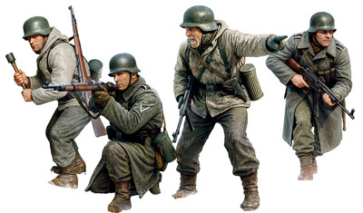 キットには2枚のプラスチック製ランナーが含まれています。1枚は米空挺兵と激しい戦闘を繰り広げたドイツ歩兵4体を組み立てるためのもので、もう1枚には武器や装備が収められています。