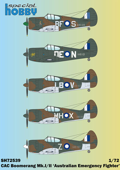 キットは- プラスチックパーツ1枚、- 透明パーツ1枚、- 機体内部・外部用の3Dプリントディテールパーツで構成。説明書とデカールには、ブーメランを実戦で運用した各RAAF飛行隊から1機ずつ、合計5種類のマーキングが含まれています。そのうち4機は緑と茶の迷彩にライトブルーの下面色、5機目は全面グリーンの塗装です。 |