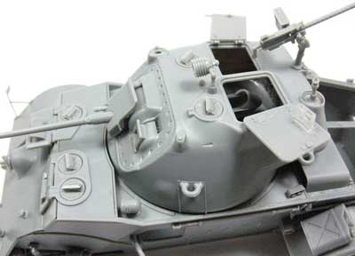 ![]() 車体側面の装備類、砲塔上の機銃、排気管など、それぞれのパーツも 精密感に溢れています。パーツの合いも良さそう、と想像できます。 機銃グリップの滑り止めモールドも忠実に再現されています。 |