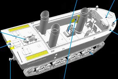 ![]() 以後のタイプと異なり煙突状のパイプが3本立っています。 また断面形も円形です。 ![]() 外見上の大きな特徴である操縦席の窓の大きさです。 中期以降に比べ面積が大きくなっています。 ![]() また、オプションで窓には丸窓が開いた板を付けれます ![]() キャビン後部は中期型以降と違い操作室ではなくハッチが付いています。 ![]() 足回りは二種類のバージョンが選択できます。 ![]() このキットにはゴムボートが付いています。キャビン上に搭載します。 |