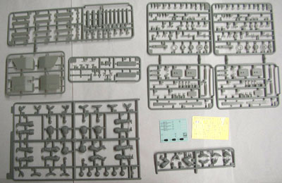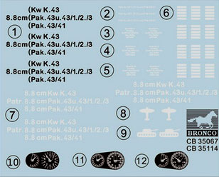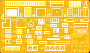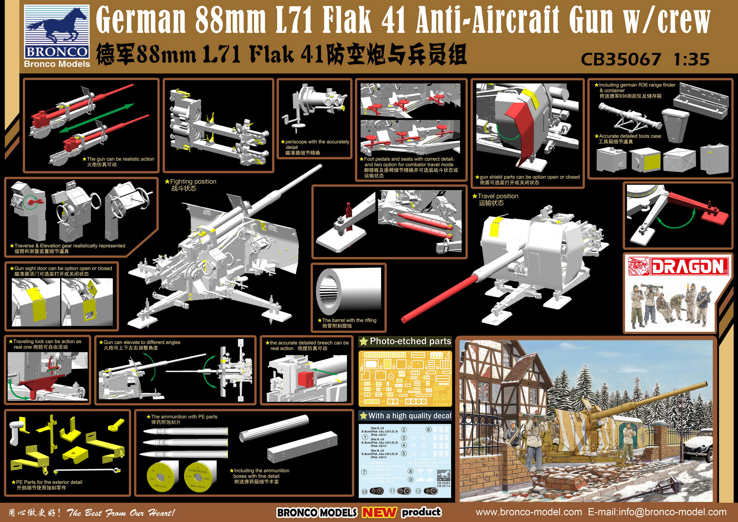 ![]() ブロンコ 1/35 CB35067 独・8.8cmFlak41高射砲+砲兵6体 価格はリストに掲載されています。ご覧下さい。 箱のサイズ385x245x55(mm) 有名な8.8cmFlak18/36/37高射砲の後継としてラインメタル社で 開発された高射砲です。砲身長は71口径と大幅に増大し射程 と威力を増していました。砲架にも様々な工夫が凝らされ砲身の 後方に砲耳を持ってくることで高さを抑え装填作業もしやすく なっていました。しかし様々な新機軸を投入したため不具合が 続出し1941年に完成しながらも1943年になるまで生産が始まらず また複雑高価な砲だったため生産数は限定的でした。 CG画像 ![]() ![]() パーツ全体です。ブロンコならではの細部まで細かく再現されています。 ![]() 砲身の根元の部分です。スライド成型で基部が開口しています。 ![]() 砲身の先端部と閉鎖器です。スライド成型されています。 ![]() 駐退復座機の下部レールです。俯仰用のギアも分かります。 ![]() 上部砲架側面です。砲耳が端にあるのが分かります。全体の形状 はシンプルですが様々の機器が装着されます。 ![]() 脚部です。左右の脚は前方に向かって水平に折りたたみます。 ![]() 脚部の旋回テーブルと砲基部の防楯です。 ![]() 独特の形状を持つ大型防楯です。外側の部分は折りたたむことができます。 ![]() 四角い板が駐鋤です。三角の穴に楔を打ち込みます。 ![]() 楔はスライド成型で穴が開けらています。 ![]() 携帯レンジファインダーは収納箱も付いています。 ![]() 砲弾と砲弾ケースです。砲弾ケースは写真の円筒型の他に 木製箱型のケースも含まれています。 ![]() エッチングパーツです。 ![]() デカールです。計器や砲弾ケースの刻印、キルマークなどです。 ![]() ![]() 冬季防寒服姿のドラゴン製砲兵フィギア6体セットが付属しています。 |