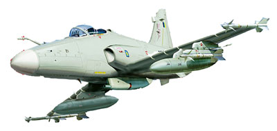 ホーク」をベースに、本格的な戦闘能力を持たせるため再設計された「ホーク 200」シリーズのマレーシア向け輸出型です。練習機型の後部座席を廃止して電子機器スペースとし、機首を延長してAN/APG-66Hレーダーを搭載しています。機首に固定用空中給油プローブ装備。翼端に空対空ミサイル(AIM-9