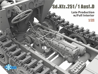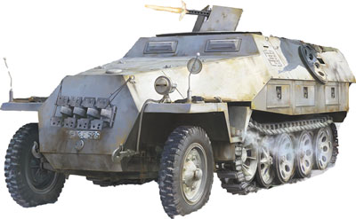 ■ドイツ軍主力の装甲兵員輸送車の大戦後期車両。エンジンをはじめサスペンション走行装置、室内を含めたインテリアをデザイン化したフルモデル。7ランナーにラバー製前輪タイヤ、金属製車間表示棒、細部はエッチングパーツを使用。履帯の装着は可動式を採用。デカールは4タイプの車両マーキングと細部のステンシル。増加装甲用のスペアロードホィールなどのアクセサリーも充実。