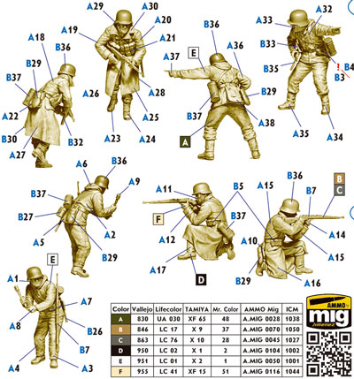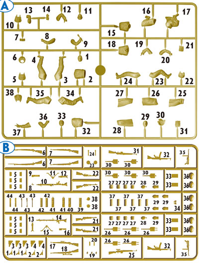 キットには2枚のプラスチック製ランナーが含まれています。1枚は米空挺兵と激しい戦闘を繰り広げたドイツ歩兵4体を組み立てるためのもので、もう1枚には武器や装備が収められています。