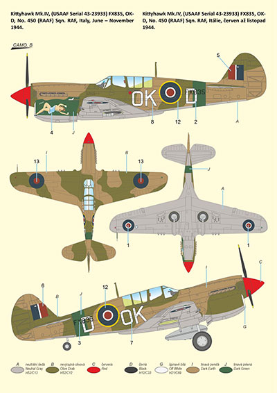 キットはオーストラリア先住民アポリニジ唯一のパイロット・レナード・ビクター・ウォーターズ軍曹が操縦したブラック・マジックと名付けられたイギリス空軍第87飛行隊の機体とイタリアで展開したオーストラリア空軍第450飛行隊の機体でカウルに半裸の少女のエンブレムが付けられていました。